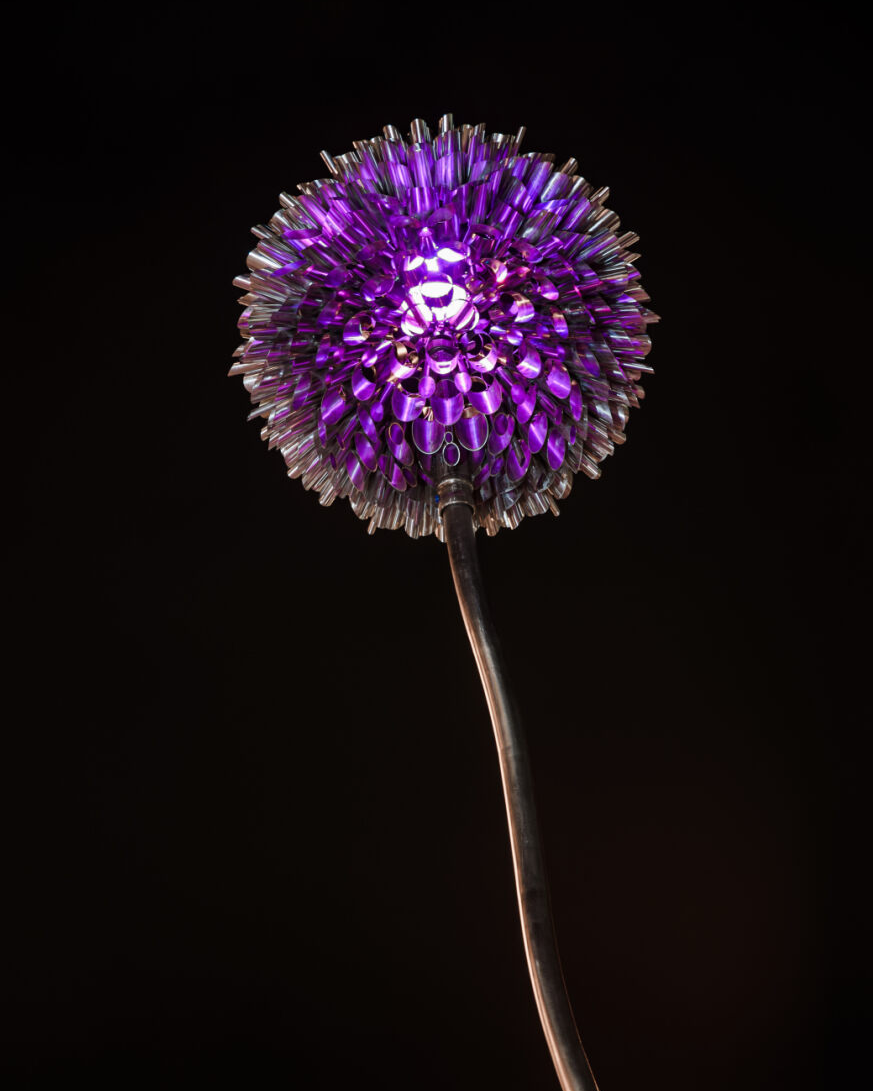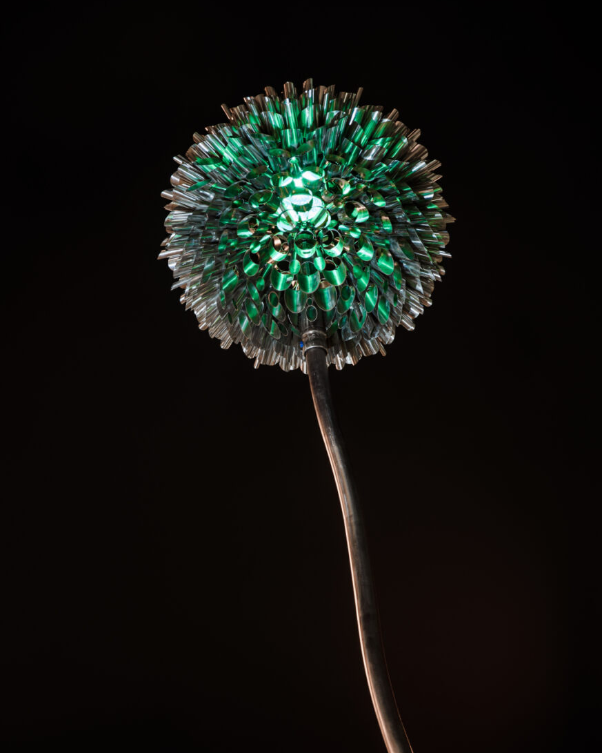 The Bloom for “Lorax” was roughly 3x larger than the previous sculpture, Sol Invictus. In the end, the flowerhead reached 5’ wide and weighed over 700 lbs. It contains over 1,000 petals, each petal receiving a slight pattern and etch.