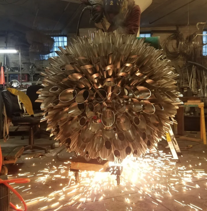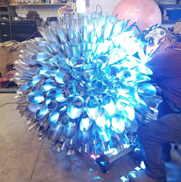 For this particular project, the clients requested the flower Bloom be as polished and bright as possible. To capture this desired effect, we decided to electropolish the flowerhead. The whole 5 ft Bloom itself was cut up into 8 sections then dipped individually into a electropolish chemical solution. This process removes 3 micron layers of the material surface, cleaning and purifying it. The Electropolished finish leaves a mirror polished / chrome like finish that refracts lights extremely well. Once complete, it was welded back up and made structural.