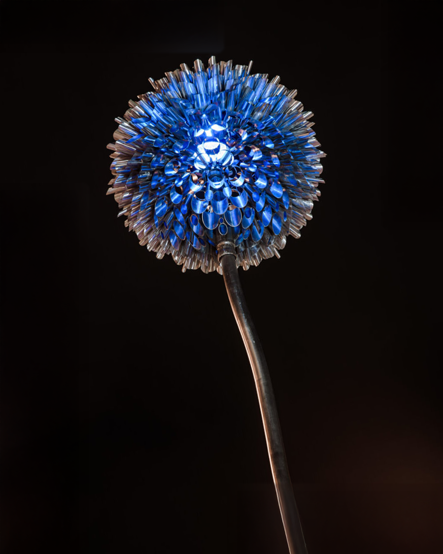 This Stainless Steel sculpture stands over 22 ft with a 5ft flower bloom attached. Inside the bloom there is outdoor-rated interactive light system. This lighting system has the ability to use data / sensors to drive the light array, giving the pedestrian control of the experience. Depending on how the viewer walks through the space, incorporates different sensors, initiating custom colorful light patterns, washing over each other.