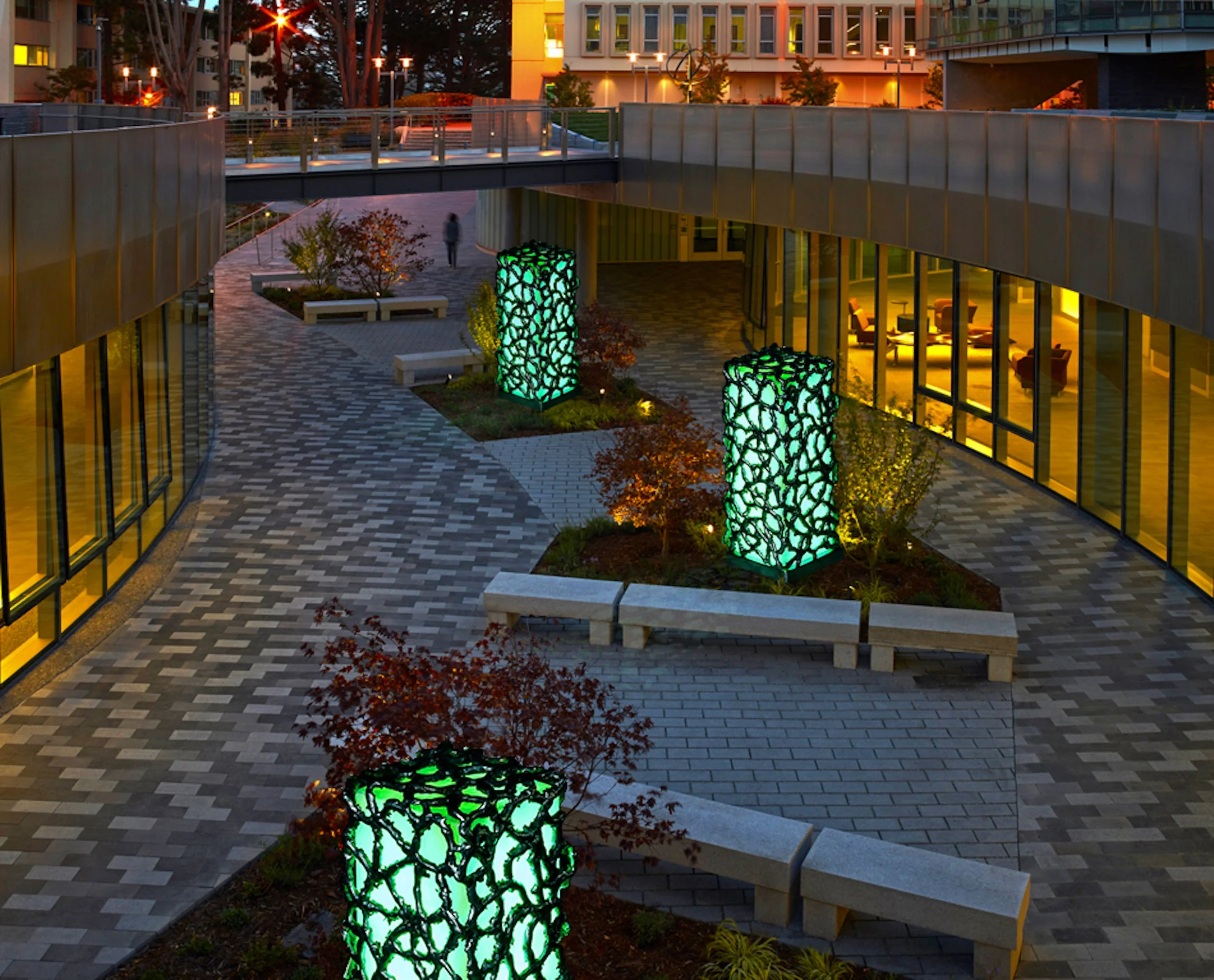 Each Nexus Tower stands 15β tall intended for a public stetting such as plazas, stadiums, and parks. These towers are fully casted from Marine Grade Stainless Steel with a glass diffuser on the inside. Within each Nexus is a state-of-the-art LiDAR camera that can detect energy and energy blobs. When pedestrians move into this location, The Nexus Towers will be aware of any presence in their environment. Using this data we can pull and guide the viewer though this space with color. There are many applications this can be used for but especially for encouraging movement in stagnant areas or guiding the viewer into less frequented areas that need more attention.